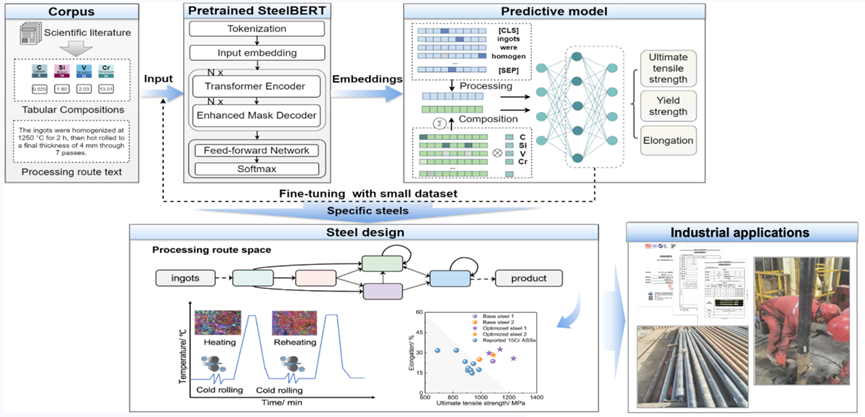 针对传统机器学习模型泛化能力受限、知识迁移困难等问题,William威廉宿彦京教授团队提出了大语言模型驱动的新材料定量设计新方法,突破了“一问题、一数据、一模型”的传统研发模式中跨体系预测能力的局限性,实现了跨体系钢铁材料开发与工程应用。基于约9.6亿词的大规模材料语料库,构建钢铁领域专用大语言模型SteelBERT,与国外同类模型相比,在性能预测任务上的精度提升约30%,填补了钢铁领域大语言模型的空白。同时,发展出“海量文献预训练+小样本数据微调”的材料智能设计方法,模型性能预测精度达90%,较传统机器学习模型提升25%。设计出深井用高强韧15Cr奥氏体不锈钢油井管材料,具有优异的强韧性(屈服强度960 MPa、抗拉强度1138 MPa、延伸率32.5%)。同时,该材料已通过CNAS标准B溶液和D溶液检测,将不锈钢抗硫化氢开裂性能提升了约10倍(10kPa-100kPa)。相关工作在材料领域国际权威期刊《Acta Material》上发表,授权国家发明专利2项,相关成果获2025年中国材料研究学会科学技术奖一等奖。研发的不锈钢材料已成功应用于油井管,并已通过工业化生产于新疆实现下井试用。