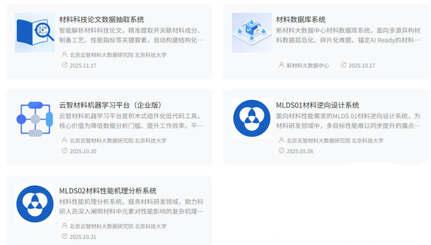 科技论文数据抽取系统、材料数据库系统、材料机器学习平台、MLDS01材料逆向设计系统、MLDS02材料性能机理分析系统五大核心数据产品,构建覆盖“数据获取-存储治理-分析建模-逆向设计-机理挖掘”全链条的数字化支撑体系,为科研人员提供一站式解决方案,全面破解传统研发中数据利用低效、技术门槛高、创新周期长等痛点。