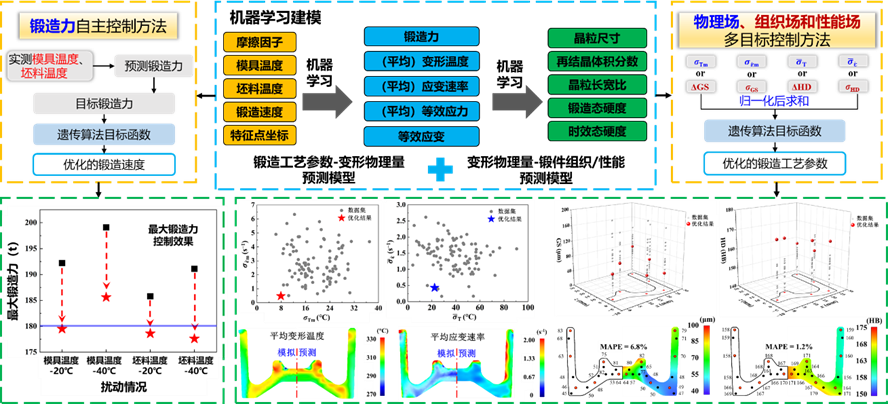 模锻成形是制造航空装备用关键铝合金构件的重要工艺。在模锻过程中,需要实现铝合金构件形状尺寸、显微组织和力学性能的精准协同调控,以满足大型复杂航空构件在组织性能均匀性和质量批次稳定性方面的严格要求。然而,构件形状尺寸复杂、模锻成形过程中多物理场和多工艺参数耦合作用,导致整个构件全场组织和性能的均匀控制十分困难。长期以来,基于经验的实验试错或模拟计算是研究模锻过程温度和变形等物理场,以及组织和性能演变的主要方法。受到实验研究条件和模拟计算速度等的限制,上述方法只能实现模锻过程的“事先设计”或“事后分析”,而无法进行实时仿真分析和在线优化控制,难以满足模锻过程数字化和智能化的发展需求。因此,构建“工艺参数-变形行为-微观组织-力学性能”跨尺度映射关系,开发高精度预测模型与智能闭环控制策略,对模锻过程数字化和智能化发展具有重要意义。